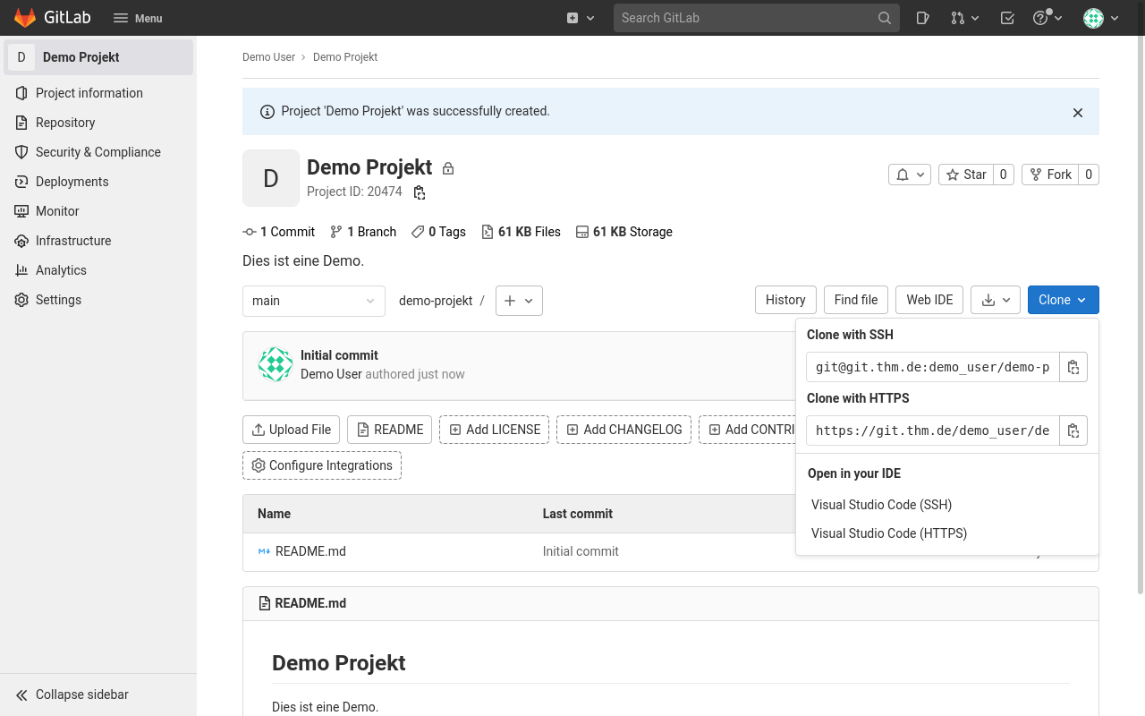 Sie können nun Änderungen vornehmen und anschließend auf git.thm.de veröffentlichen. Hier eine minimale Demo: