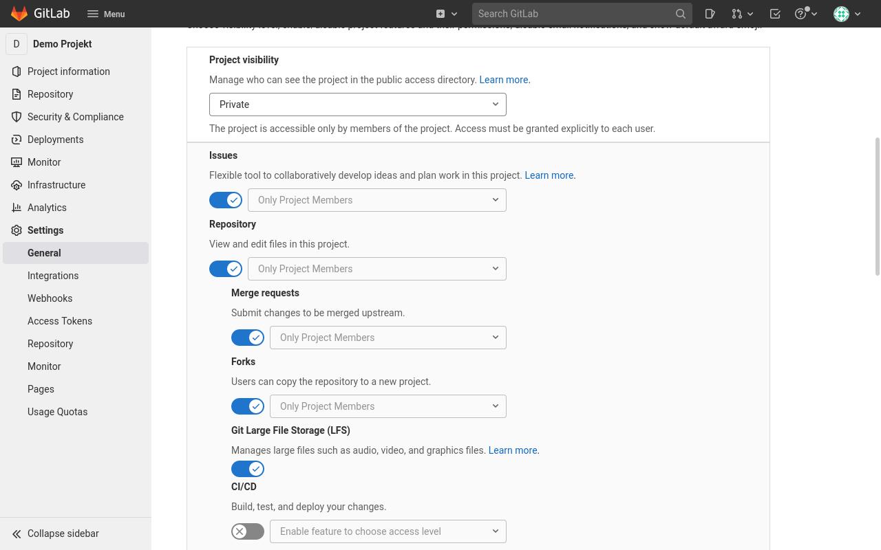 Gehen Sie in die Einstellungen Ihres Projektes. Klicken Sie dazu in der linken Seitenleiste auf Settings. Öffnen Sie den Reiter Visibility, project features, permissions. Aktivieren Sie den Knopf für CI/CD: